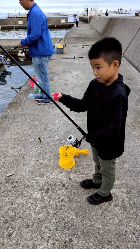 青いズボンの男の子が釣っているのはヒイラギという、サビキや投げ釣りをしているとたまに釣れるお魚で唐揚げなどで食べられるお魚です!