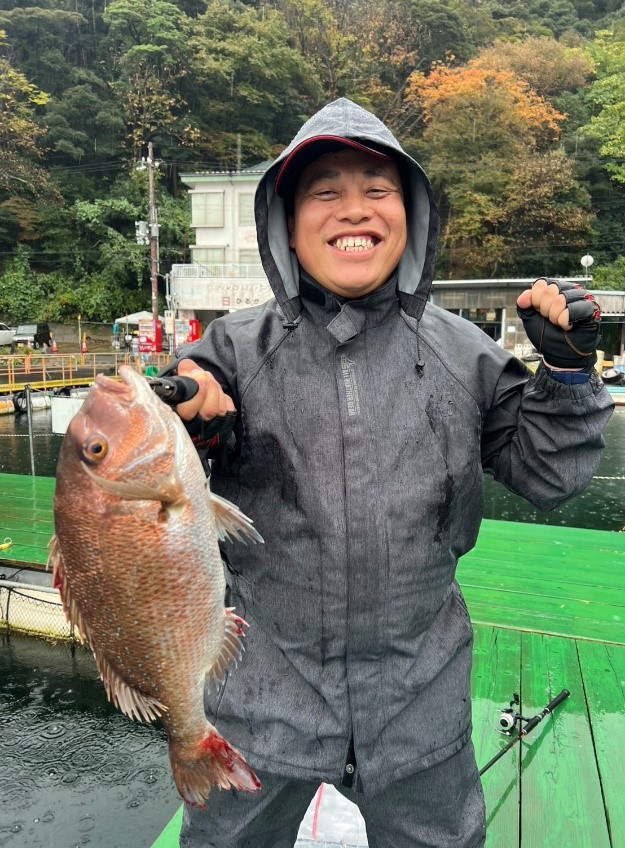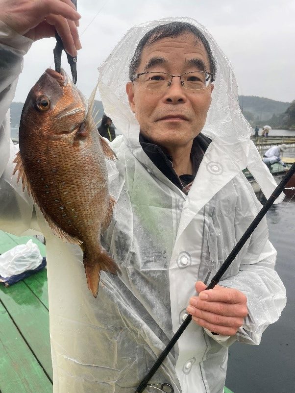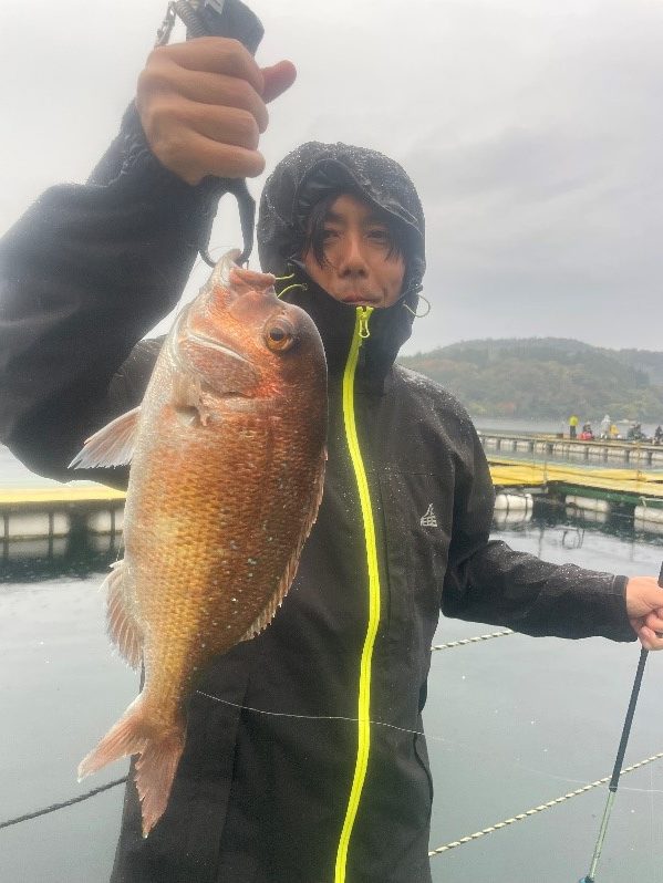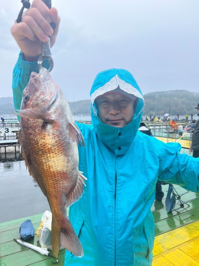生憎の雨でしたが釣果の方は全員マダイ安打!!