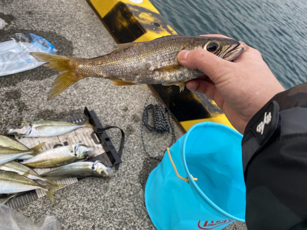 サイズが20~25cmでたまに29cmぐらいのが釣れていて、ジグヘッドは、1.5~2gがおすすめです。たまにムツも交じり、この時期はアジがデカいし、ボトム付近に居るので、フォールスピードが早い方が効率が良いと思います。ワームはイージーシェイカーで