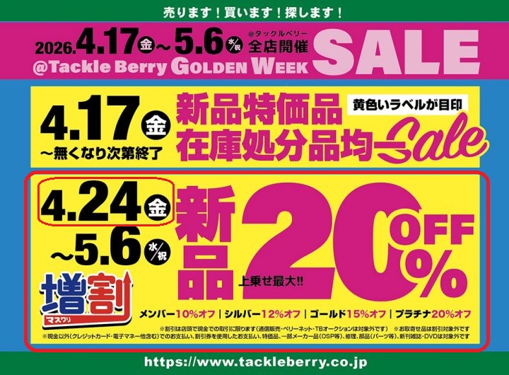 本日4/24からはセール第二弾。最終日5/6まで通常新品商品が、会員様なら+UP割引!!