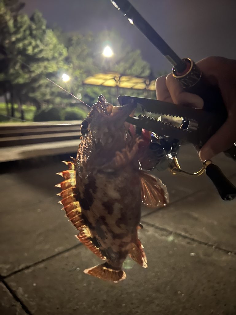 台風前でしたが、前半は穏やかな風でジグ単の操作も問題なくできており、早々に大きめのカサゴが釣れました!