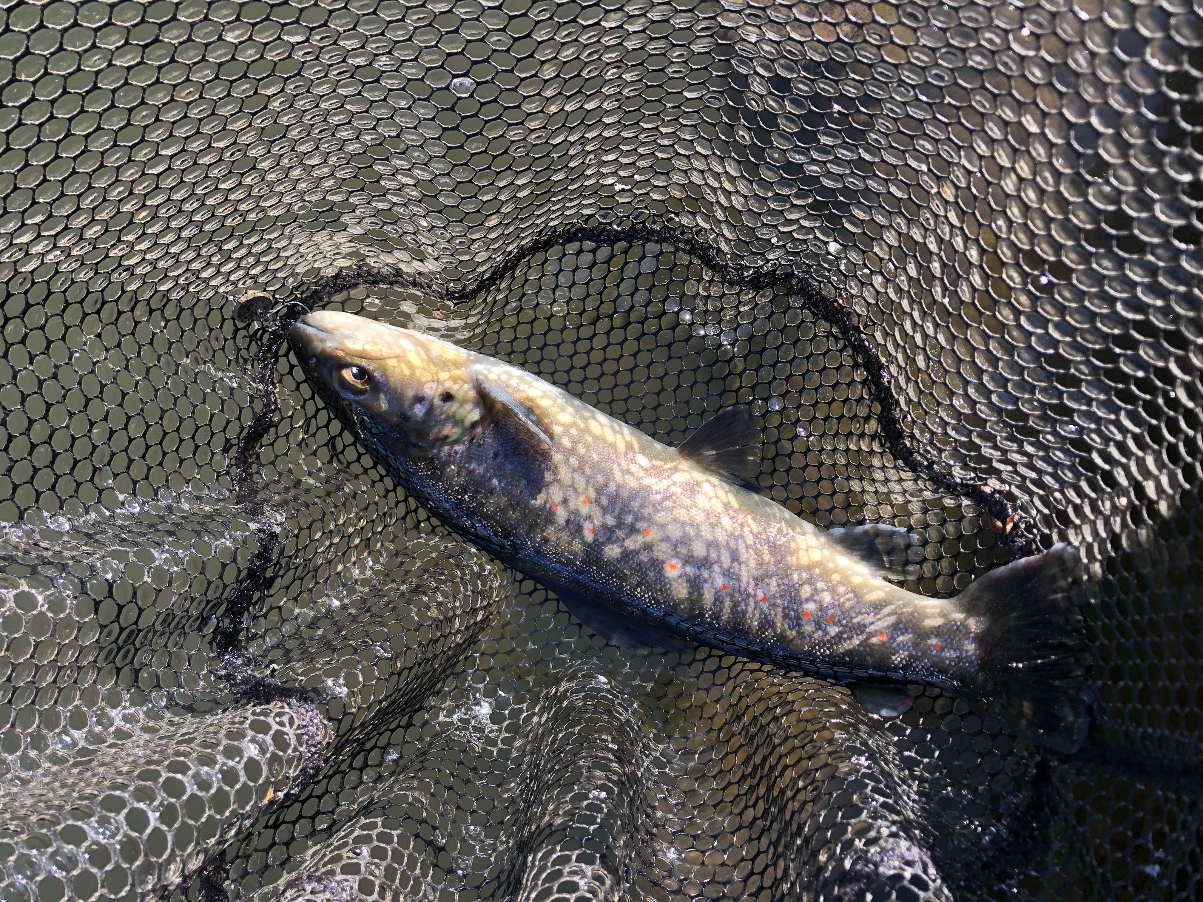 まずは下池でバスを狙います。が…ノーバイト。下池にはブラウントラウトもいるのでまずは見えている個体をバベルでキャッチ。