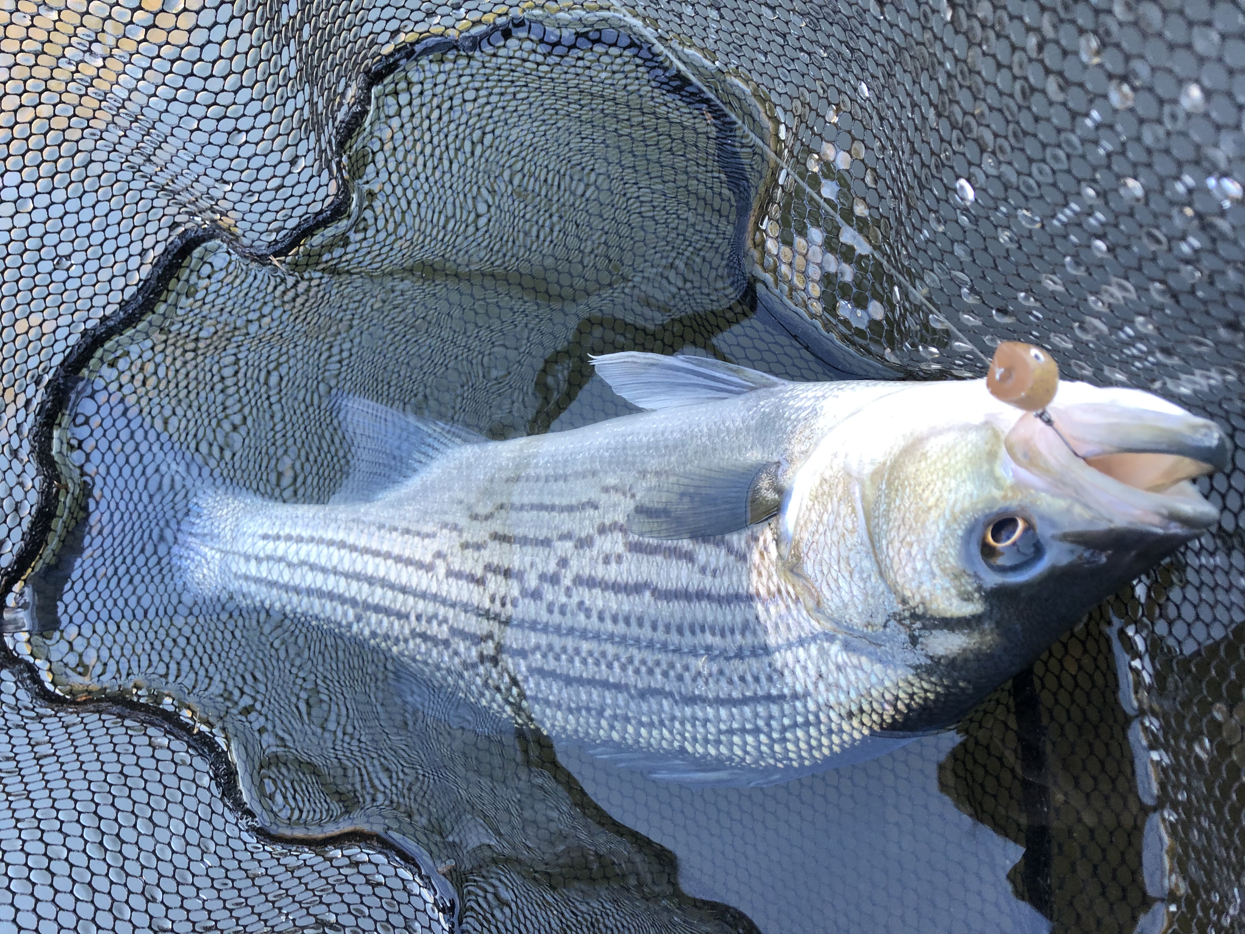 ペレット系のルアーに反応が良いことが分かったので、スプラッシュトップを投げるとストライパーが下から浮いてきてバクン!しかしバイトが浅く、乗せきれず。そのあと何度か針にかかってもバラシが続いてしまいました。