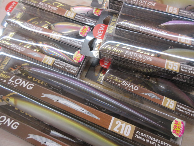 まずはバスルアーから! デュエルの人気シリーズ・ラトゥール、シャッドやラトリンバイブなど入荷しています。とくに上尾店初入荷はロング210ですね! ビッグベイトより長いのに細い!「バスミノー最長サイズ」を謡っていますので、ぜひお試しください