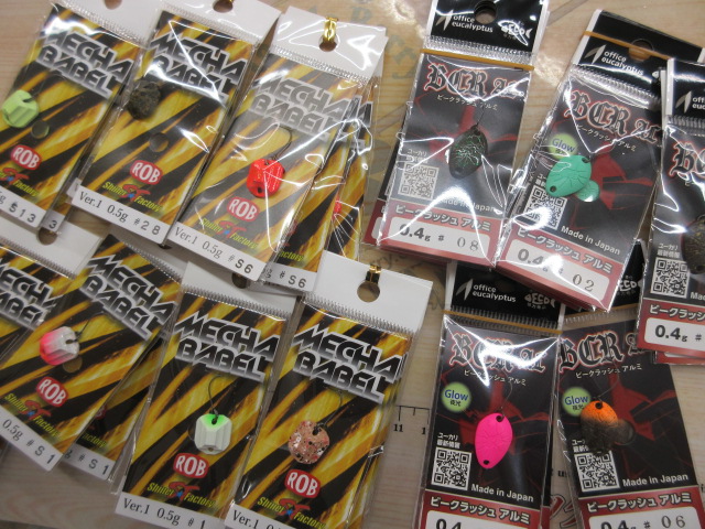 新品も朝から届いておりまして、エリアルアー、トラウト向けのラインなど。