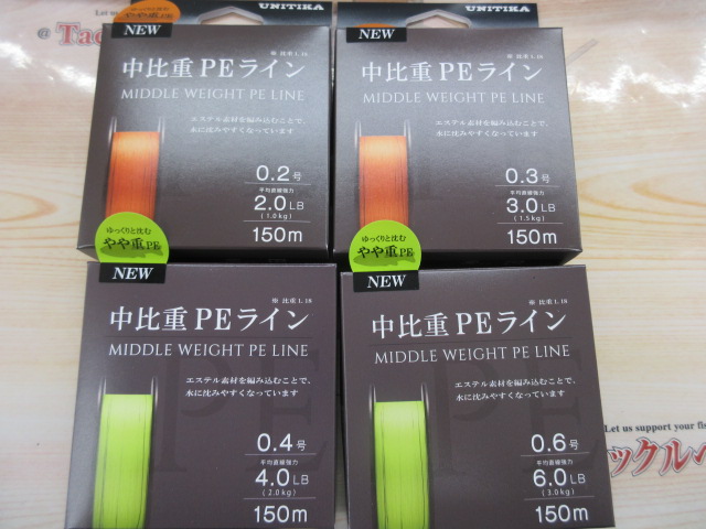 ユニチカの中比重PEラインも届いていますよ~「やや重」です。ゆっくり沈んで風に強い、エリアトラウトやアジング、メバリングなど軽いルアーに使ってみてください♪