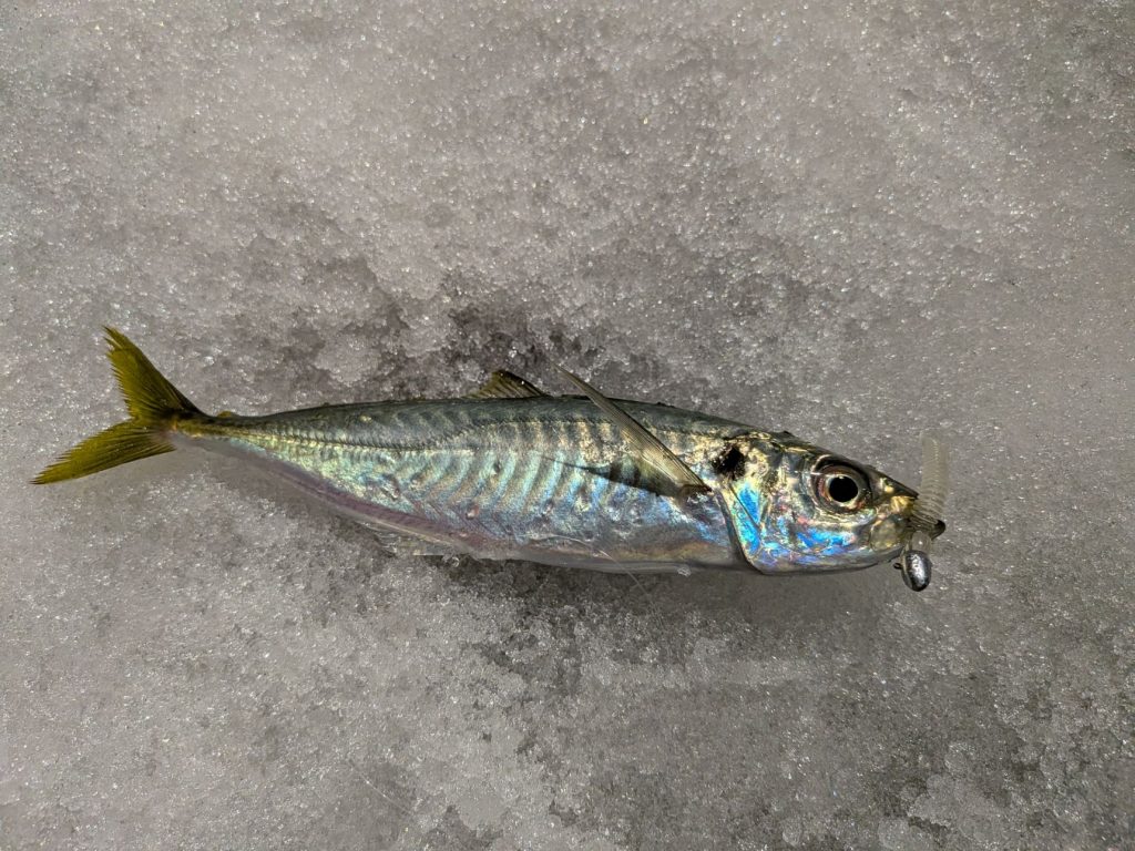 その後、水面でパチャパチャしていたので、アジングタックルに変えると1投目でムロアジをキャッチ!