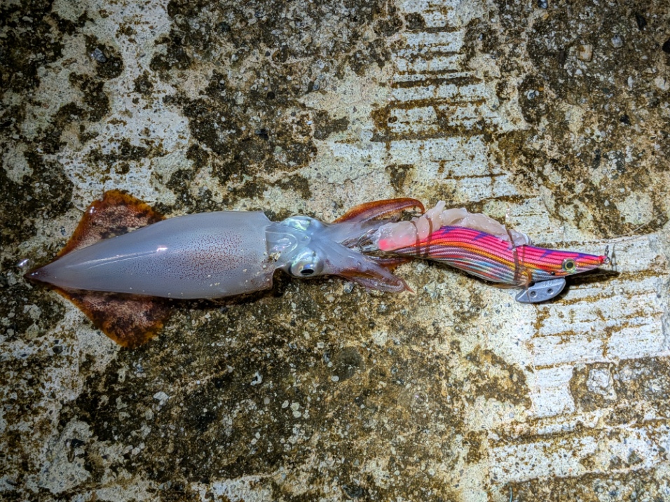 横の方が餌巻きエギで釣っていて、なんとか1匹釣れないかとボトムを探っていたところで1匹キャッチ(`・ω・´)b