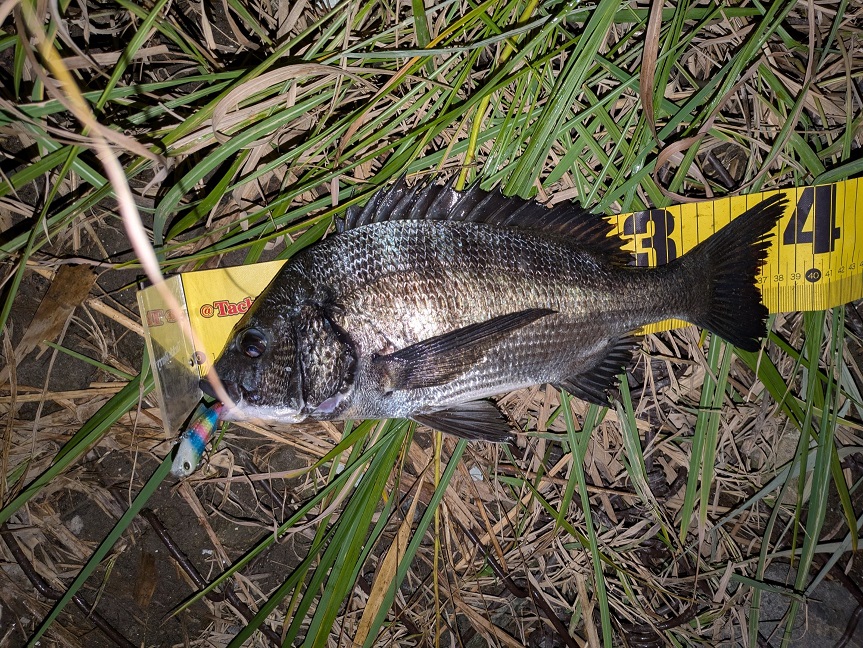 ならばと、キックビート15gで更にレンジを下げ、ベイトの下を通すとバイトがあり、予想外の38センチのクロダイが釣れました☆
