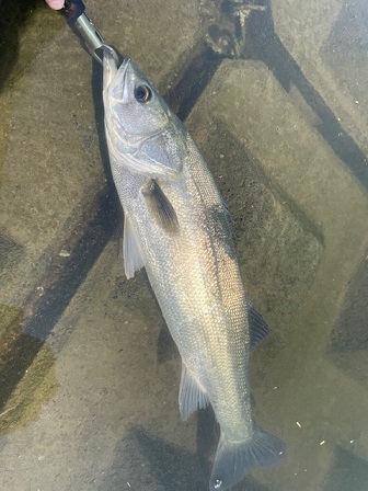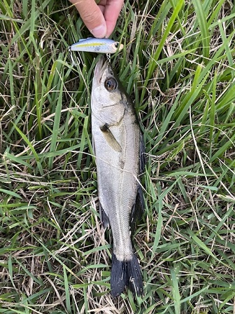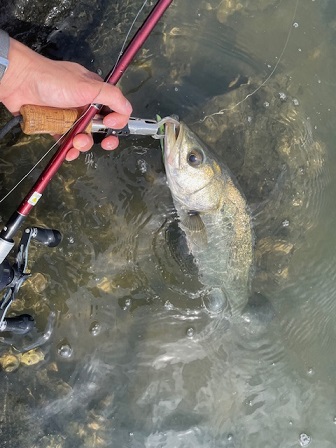 お店の目の前を流れる砂押川で初めて休憩時間に釣った極小チーバス笑