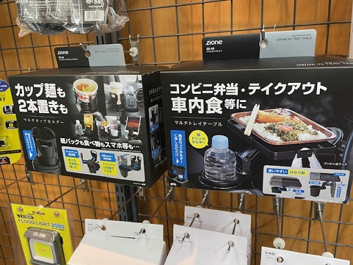 右のトレイテーブルはパッケージの通りお弁当など置けてこれもドリンクホルダーに付けるので
