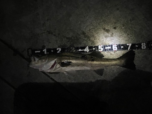 水面まで浮かせるとでっかいシーバス。タモはないのでスロープまで200mほどお散歩して