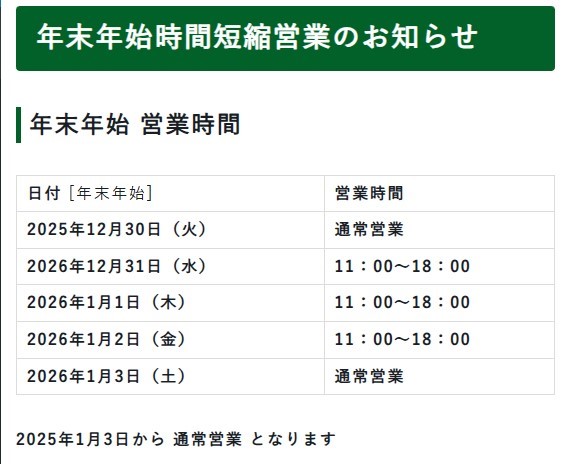 ↓↓年末年始は営業時間が一部変更になります↓↓