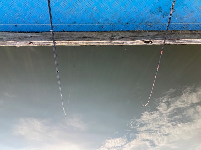 釣り座は桟橋のいつもの場所へ。水深13〜14m。