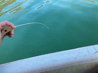 右手で水面から手繰り、左手に手繰った糸を渡し、そのまま糸を床に置いていくという動作です