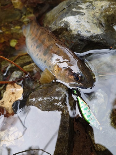 川の流れが当たって岩の下が掘れているポイントで、ルアー後方から良さげな影が追従してきて、ゆっくりとルアーを咥えました。