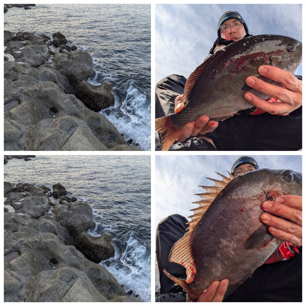 朝一から10時頃迄は水温高く、水を触ると生暖かい感じで、魚の活性高く、釣果は30cm前後の口太グレが前半入れ喰い。35cm以下の為、全てリリース!(楽しすぎて写真撮るの忘れてました😢)