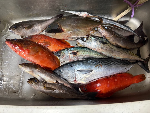 カツオやオナガグレは同行者の釣果です。