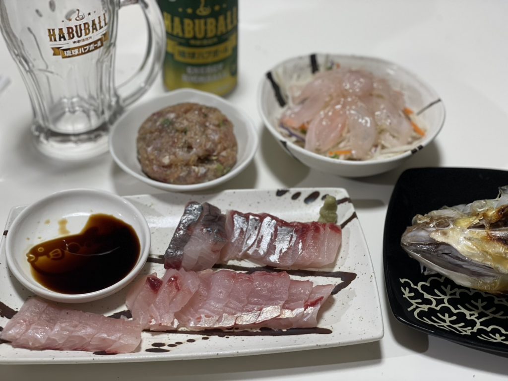 帰宅後マブタシマアジ(仮)はお刺身、カルパッチョ、なめろう、塩焼きに。