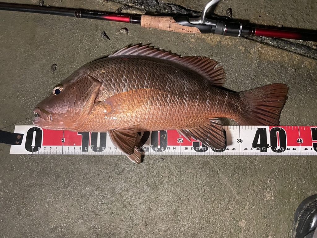 引き揚げてみると ルアーをしっかり丸呑みした30強くらいのミーバイ。