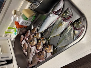 技ありで見事なハマチを釣り上げることができました。再び沈黙モードに入り、周りの方があきらめモードに入っている中、棚をとりまわりの人が狙っていない棚にあわせると、沈黙破りの縞鯵をゲット。