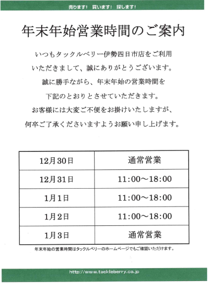 さて年末年始は営業時間が変更となっております。ご注意ください。