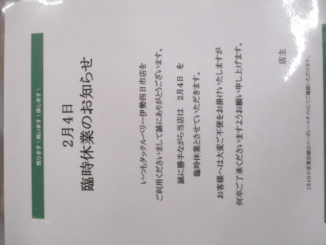 2/4 臨時休業のお知らせ – 伊勢四日市店(Ise Yokkaichi)