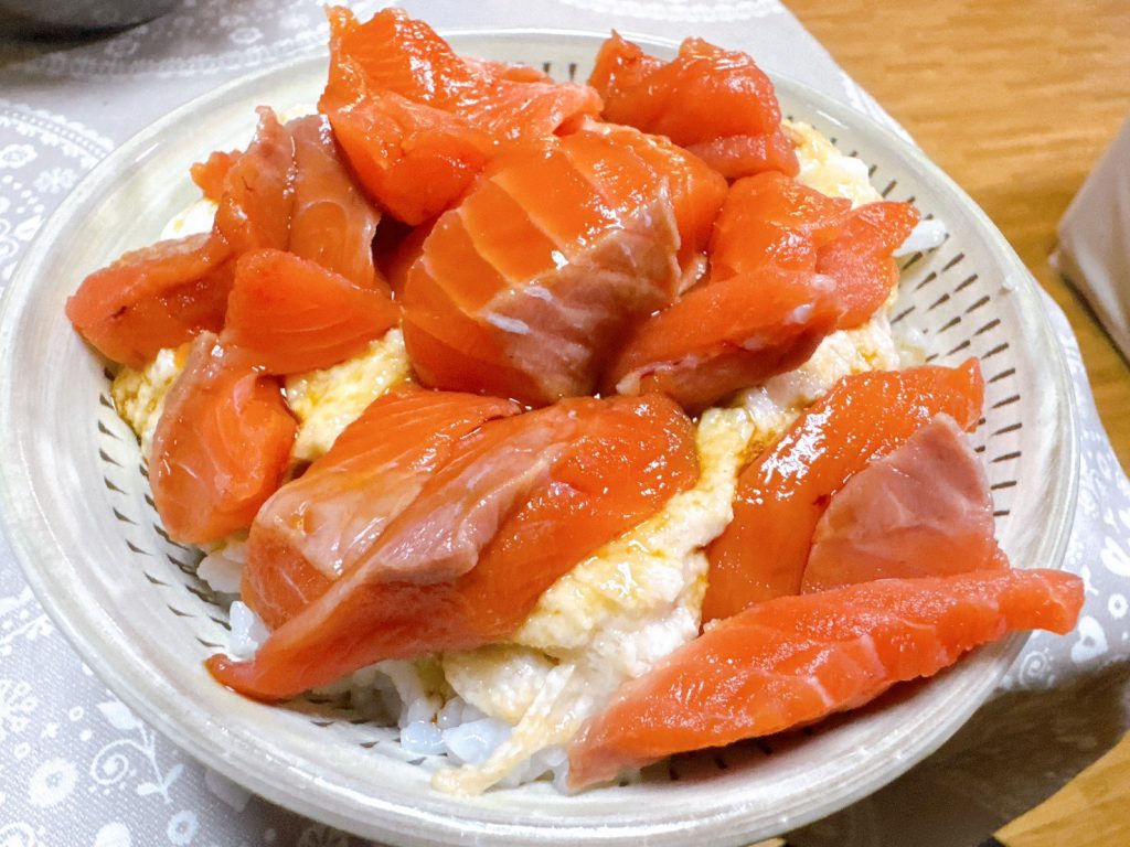 これをあつあつのごはん🍚に乗せて、ニジマスの漬けとろろ丼にしてみました!