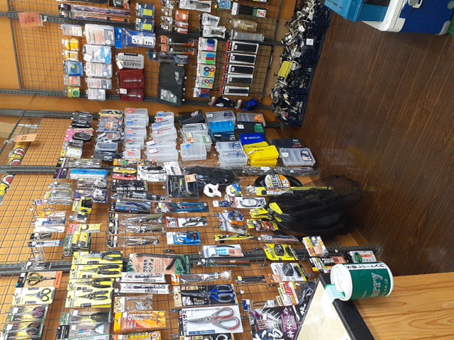 プライヤーやフィッシュグリップ、中古ライン等はだいたいこのコーナーにございます!