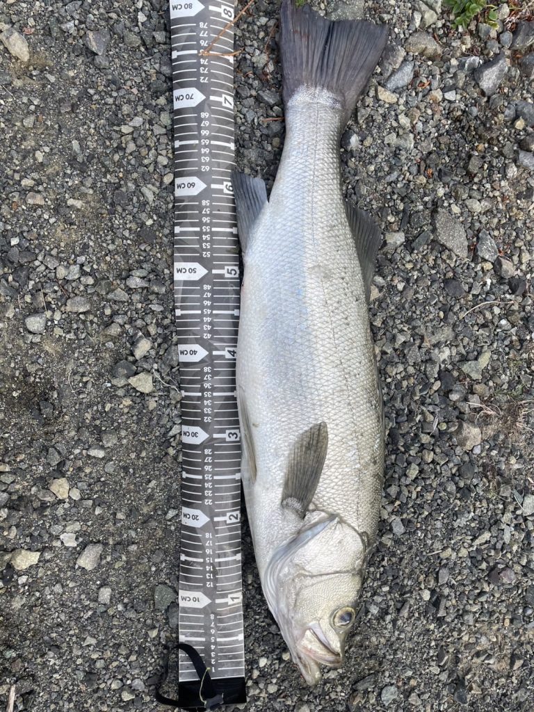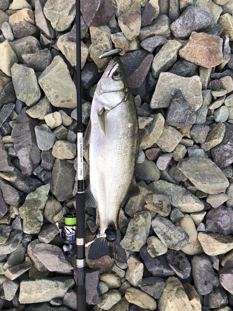 48センチとサイズは物足りないが立派な初ヒラスズキ!