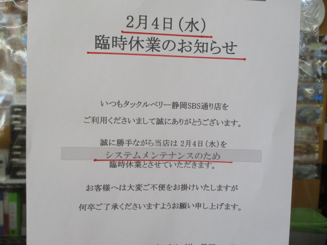 2月4日(水)店休日のお知らせ – 静岡SBS通り店(Shizuoka SBSdori)