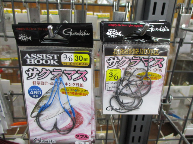 自作したい方はバラフック、すぐ使いたい方はアシストフック完成品もこざいます。昨年は人気で早いうちに売り切れてしまいました(^_^;)がまかつフックは刺さりが良くておすすめです!さくらますだけじゃなく、根魚などにももちろん使えますよ♪