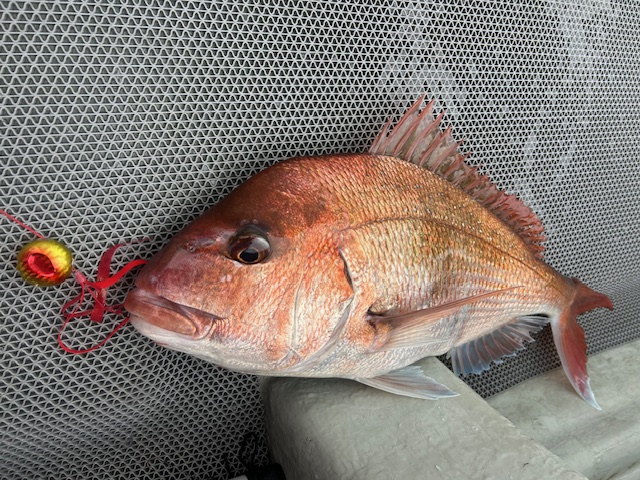 船内であちこちでロッドがぶち曲がる、怒涛の真鯛ラッシュに突入しました。