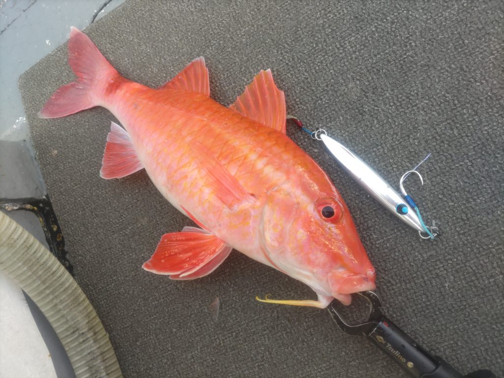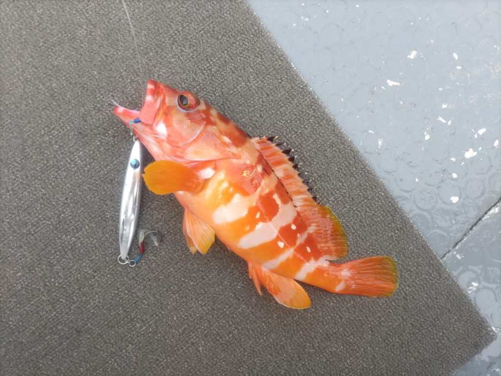 西方面の水深40m前後からスタートし、まずは大好きなチビウロコオリジナル:60gを丁寧にシャクってアカハタ… ただ、この日は終始、上潮が良く動き序盤戦こそ60g~80g前後を使ってポツポツと根魚を拾い釣りしていましたが、あっという間にラインが払い出してしまうため、一気にジグウェイトを120g~160g前後を使い分け…