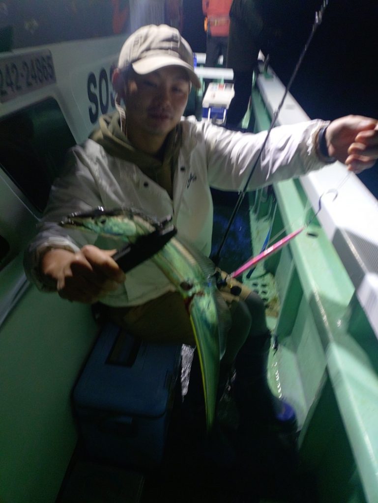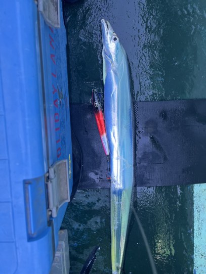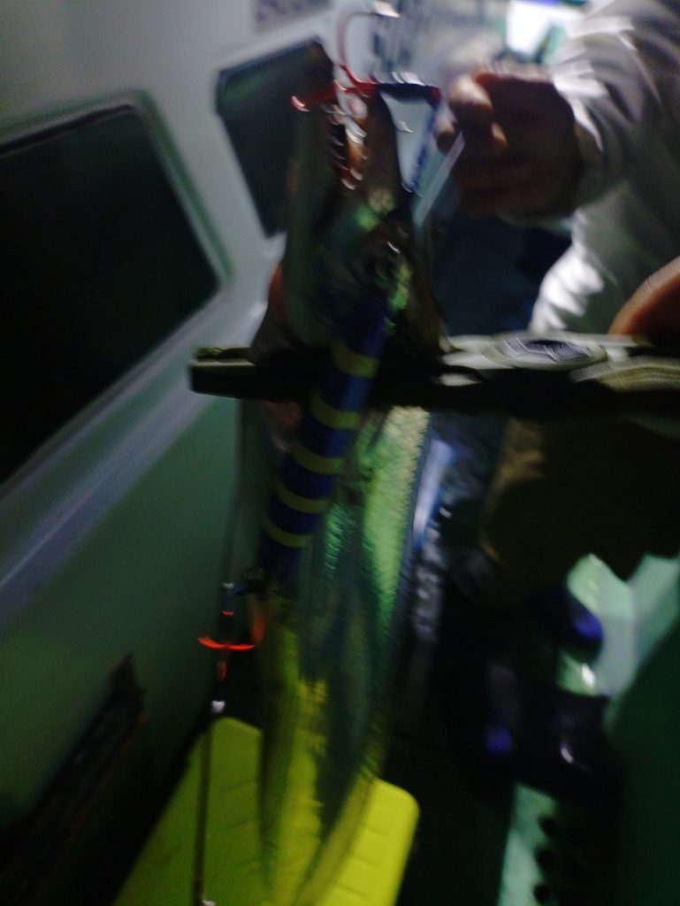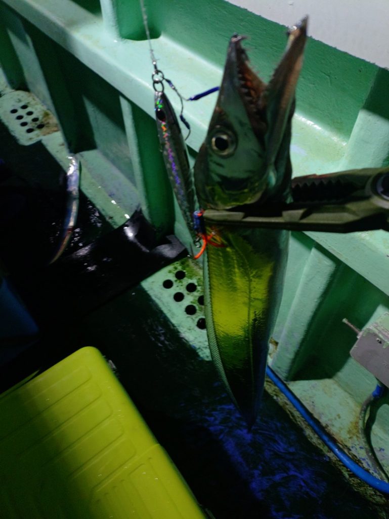 最後沖上がり寸前に私に良型太刀魚がヒット。ジグはゼスタ:アグラーム橋安丸カラーでした。