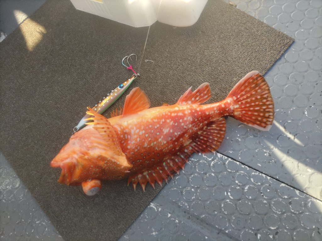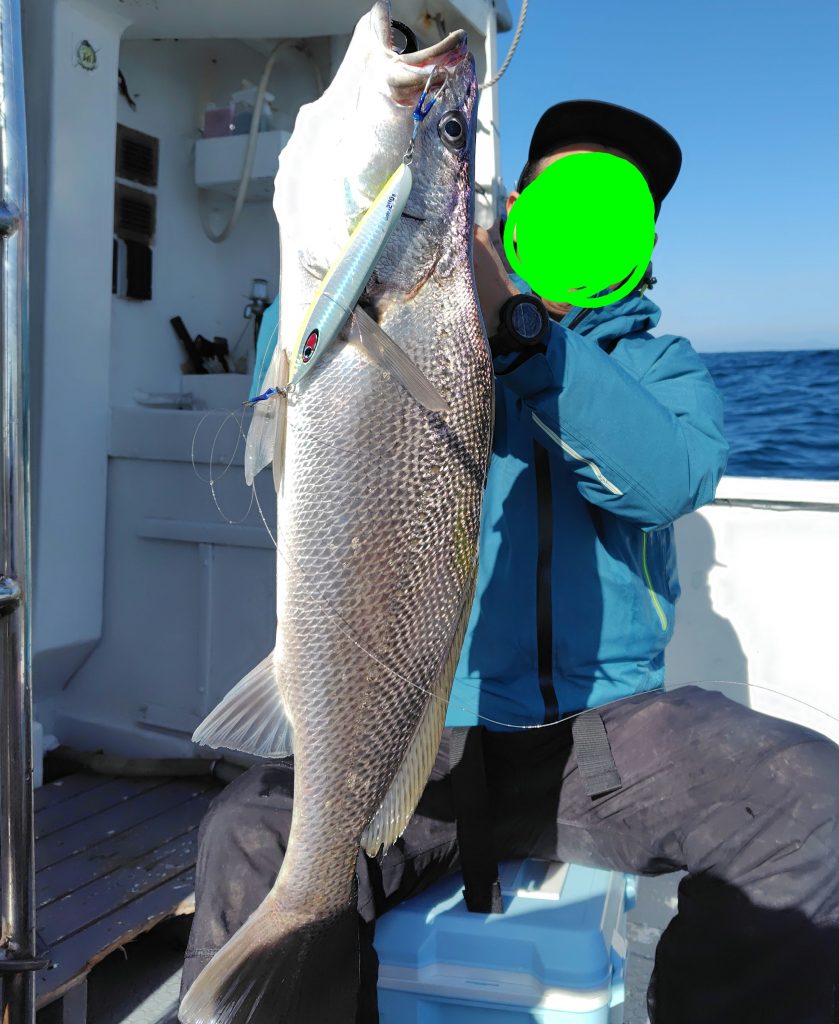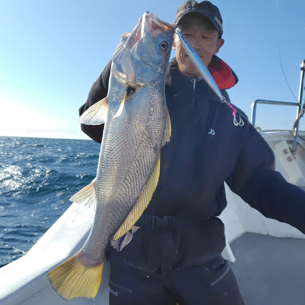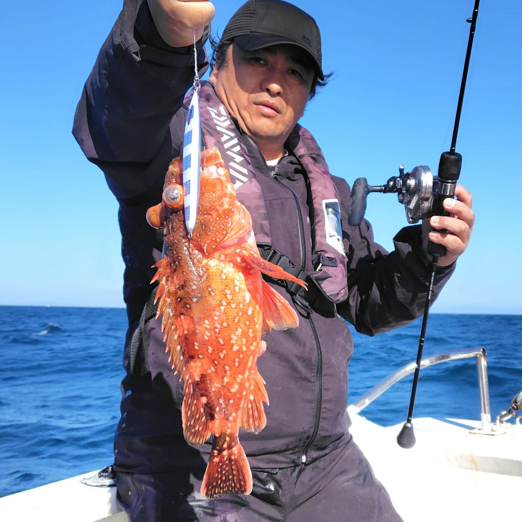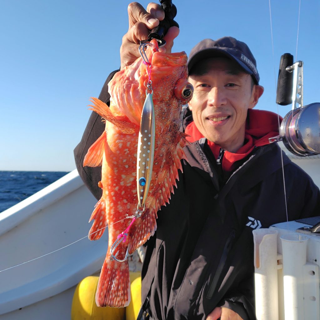 中盤戦、ライトタックルを積んでいた仲良しさんにお声掛けし、ジグも少し軽めを使っていただくと、アラッ不思議… 良いサイズのウッカリカサゴ・オオニベをキャッチ♪ 最後にカンパチらしき良いお魚を掛けましたが、惜しくもフックアウト…