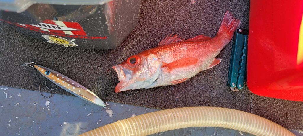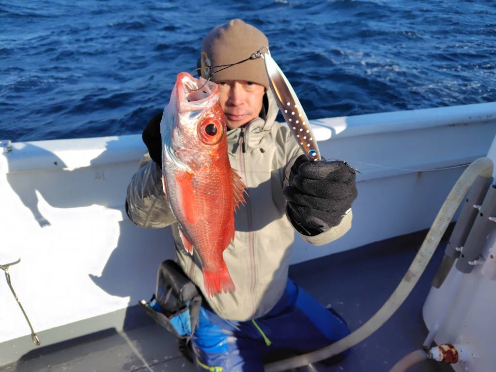 12/7(日)届きたてホヤホヤの画像です… 御前崎:敬真丸さんの中村船長からも速報でいただいていましたが、当店の常連様で仲良しのN村名人からお写真をいただきました! 当日は潮無し・風無しの激渋確定コンディションの中、リリースされて間もないウロコジグショート:300g「マスカットタルト」で見事!アカムツを引き出していただきました♪ N村名人、魚種問わず、このカラーとの相性が良過ぎます!&ありがとうございます!