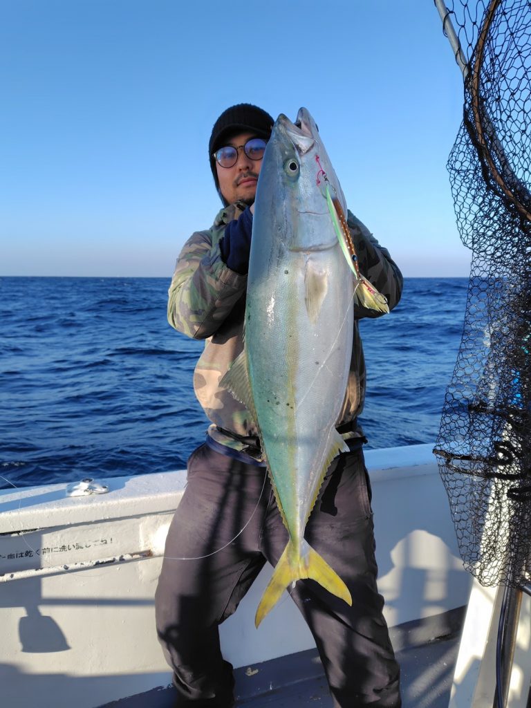 このラグビーボールの様な見事な魚体! しかも、お口にぶら下がっているのはワタクシの監修させていただいたウロコジグショート 240gのマスカットタルト!!! フォール中にじゃれつく気配を感じ、着底からの少し早めのワンピッチでズドンッ!と狙い通りに仕留めたそうです♪ しかも、この日は潮悪く、朝のわずかな時合にタックルとジグを合わせたアングラーさん数名しかお魚の顔を拝めなかったとのこと。 お見事としか言いようがありません… 翌日は釣り仲間と鰤しゃぶパーティーとおっしゃってました~!