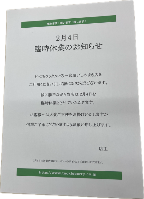 臨時休業のお知らせ – 宮城いしのまき店(Miyagi Ishinomaki)